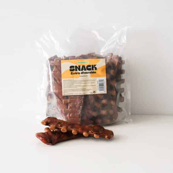 Snack para perros nutricionalmente equilibrado, sin azúcares añadidos, cereales ni gluten, con forma de costilla a la barbacoa. Rico en carbonato de calcio, ayuda a mantener huesos y dientes fuertes.