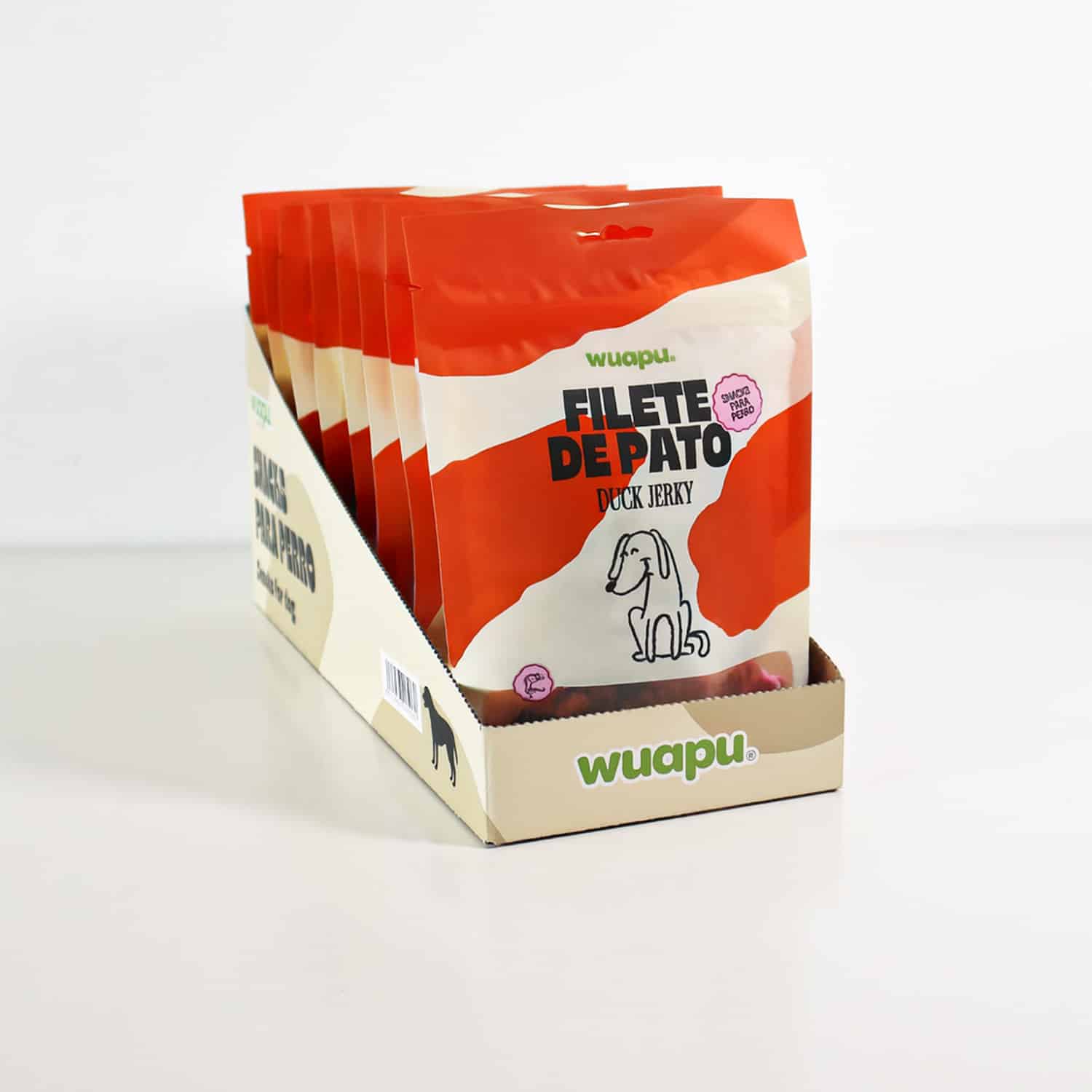 Snack para perros compuesto de tiras de carne de pato desecada. No contiene cereales, por lo que es un snack gluten free. Formatos en pack de 12 bolsas de 100 g o bolsa única de 500 g.