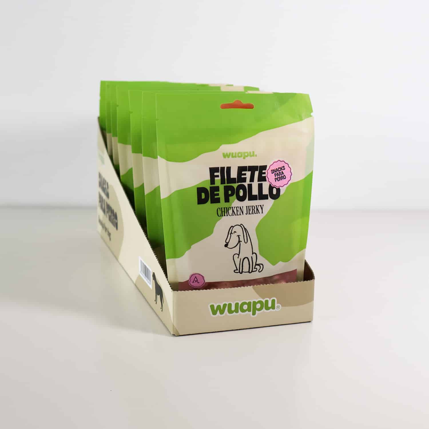 Deliciosos snack natural para perros compuesto de tiras de carne de pollo desecada. Su txtura semihúmeda facilita la masticación y es muy sabroso para los perros. Además, en un premio sin cereales por lo que es gluten free, perfecto para perros con digestiones sensibles.