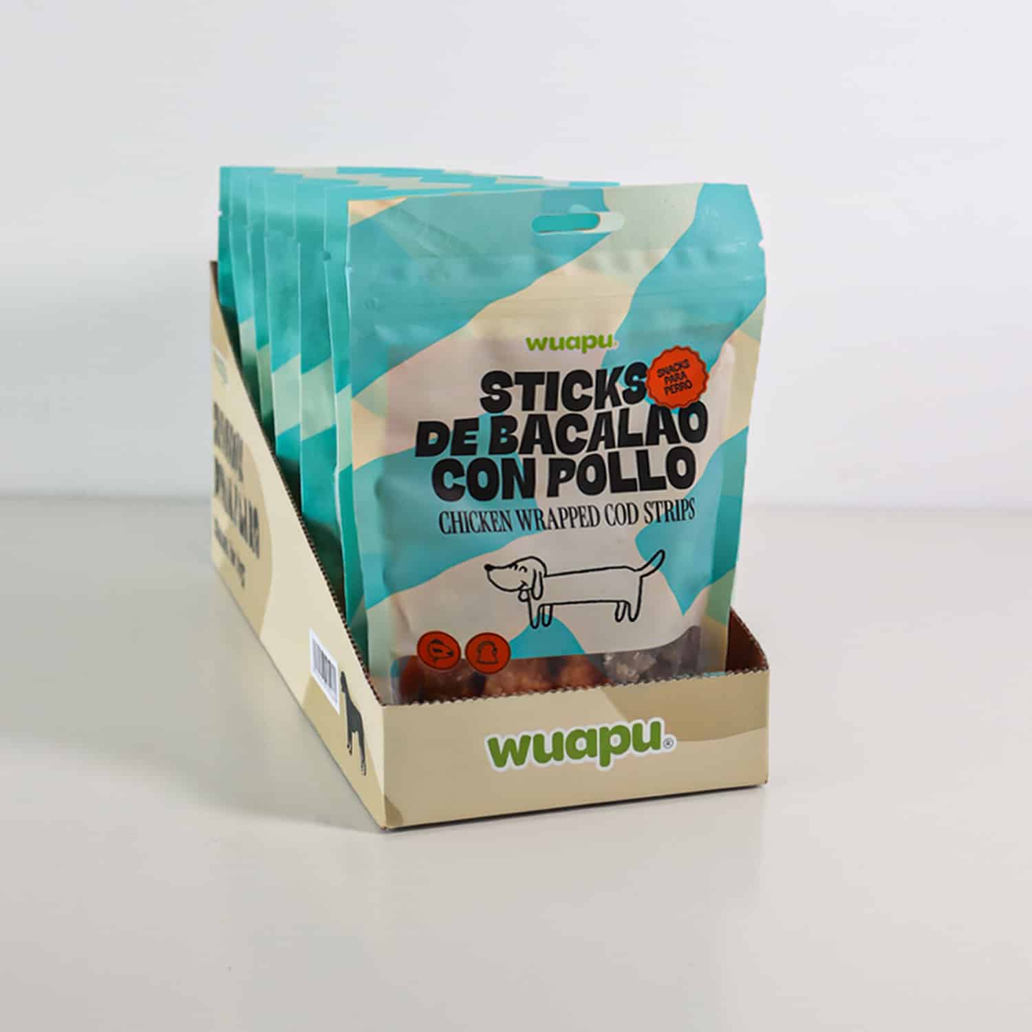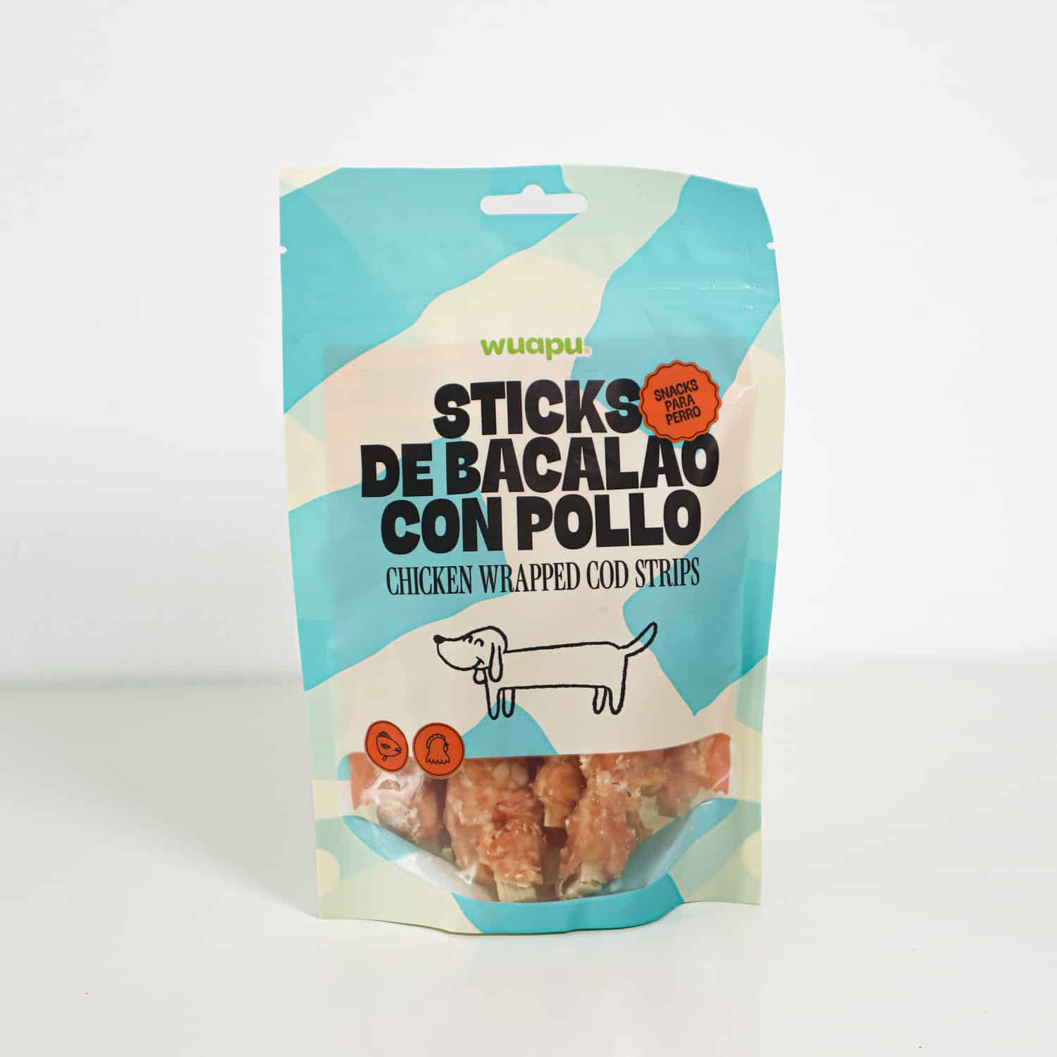 Snack para perros por un stick de bacalao desecado rodeado de carne de pollo desecado en tiras. El bacalao es rico en Calcio, Potasio, Fósforo y ácidos grasos omega 3 que ayudan a reducir el colesterol. Los sticks tienen una longitud aproximada de 6 cm.